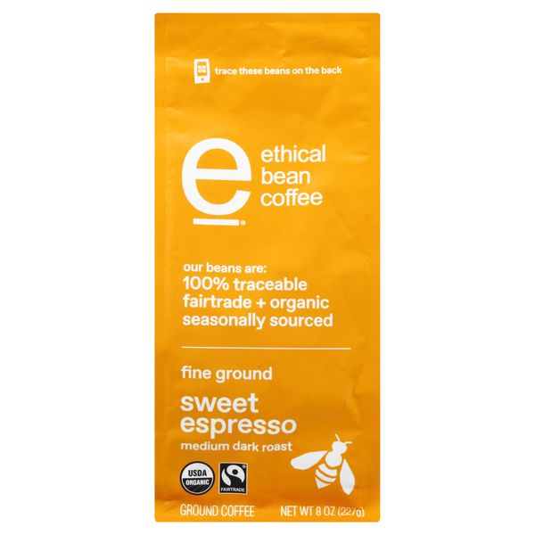 Bag of ETHICAL BEAN Sweet Espresso Medium Dark Roast ground coffee 100 ARABICA COFFEE. Grown without the use of synthetic pesticides and fertilizers. Fair Trade certified Organic certified Specialty grade 100 Arabica Customer review loved this coffee since the first time i tried.